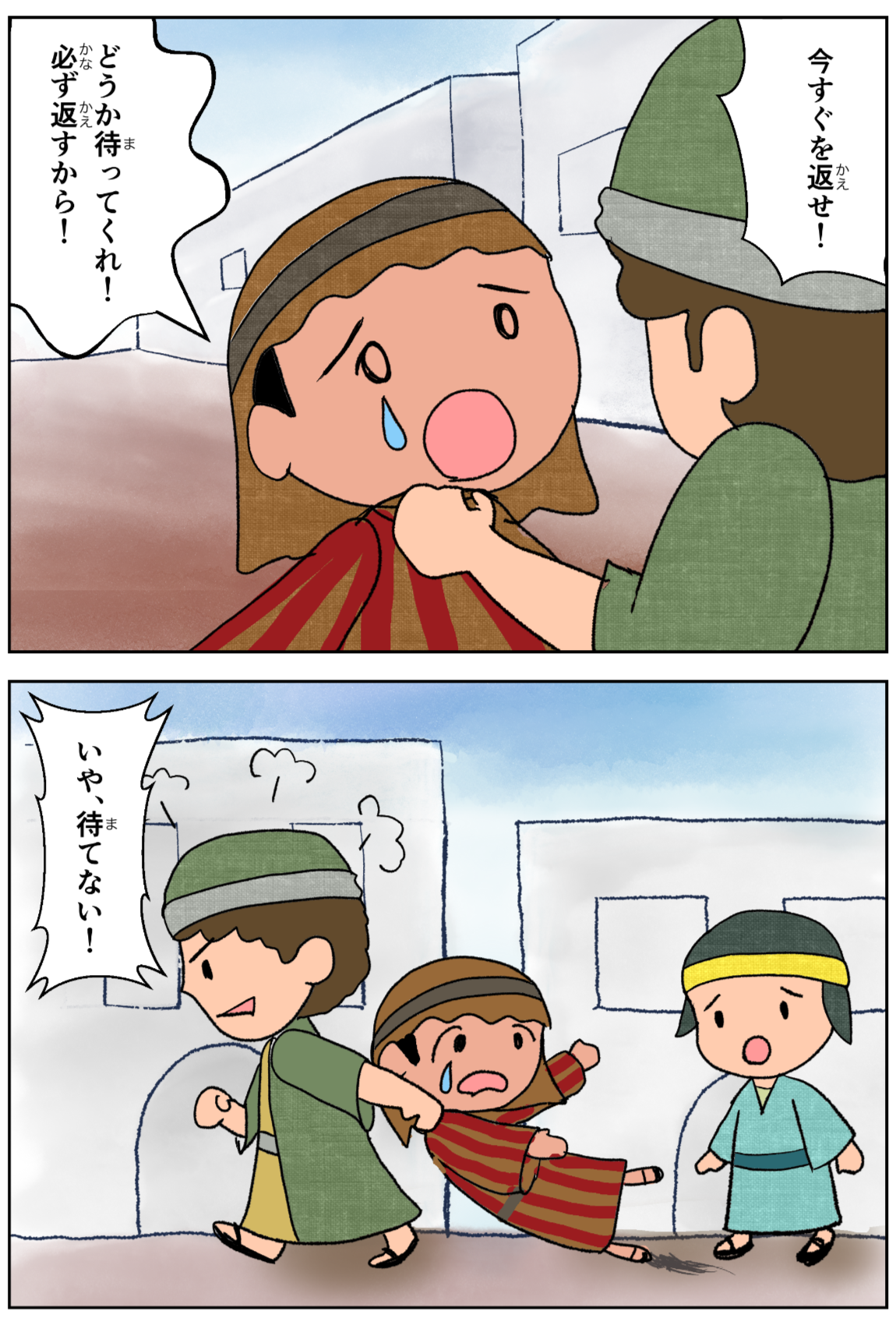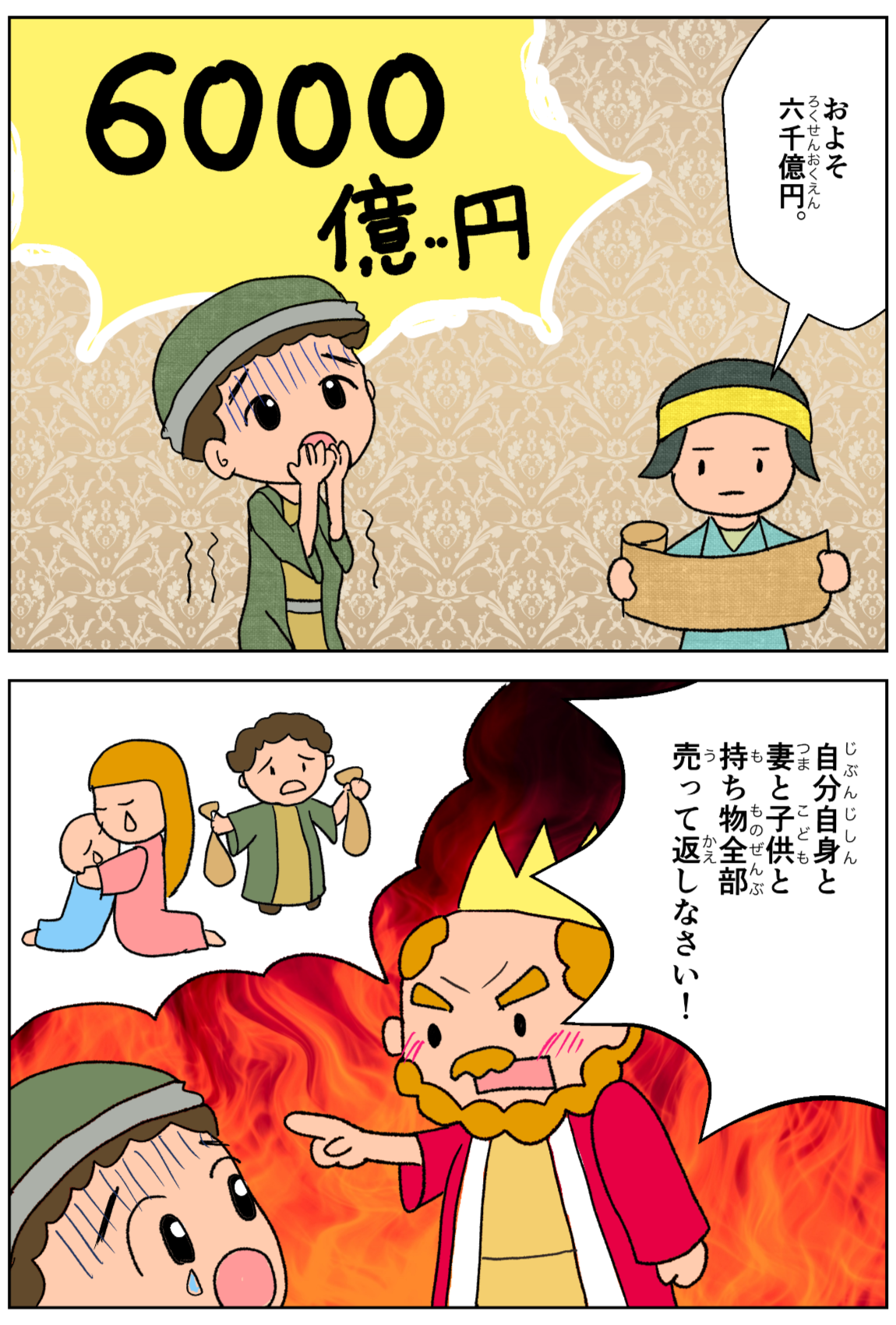 しかし、返せなかったので、主人は、その人自身とその妻子と持ち物全部とを売って返すように命じた。