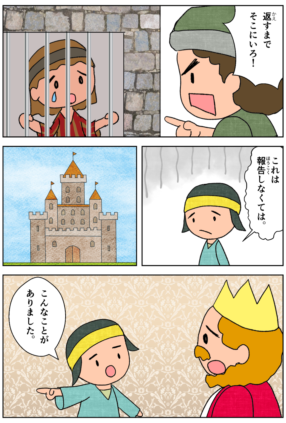 そして主人は立腹して、負債全部を返してしまうまで、彼を獄吏に引きわたした。